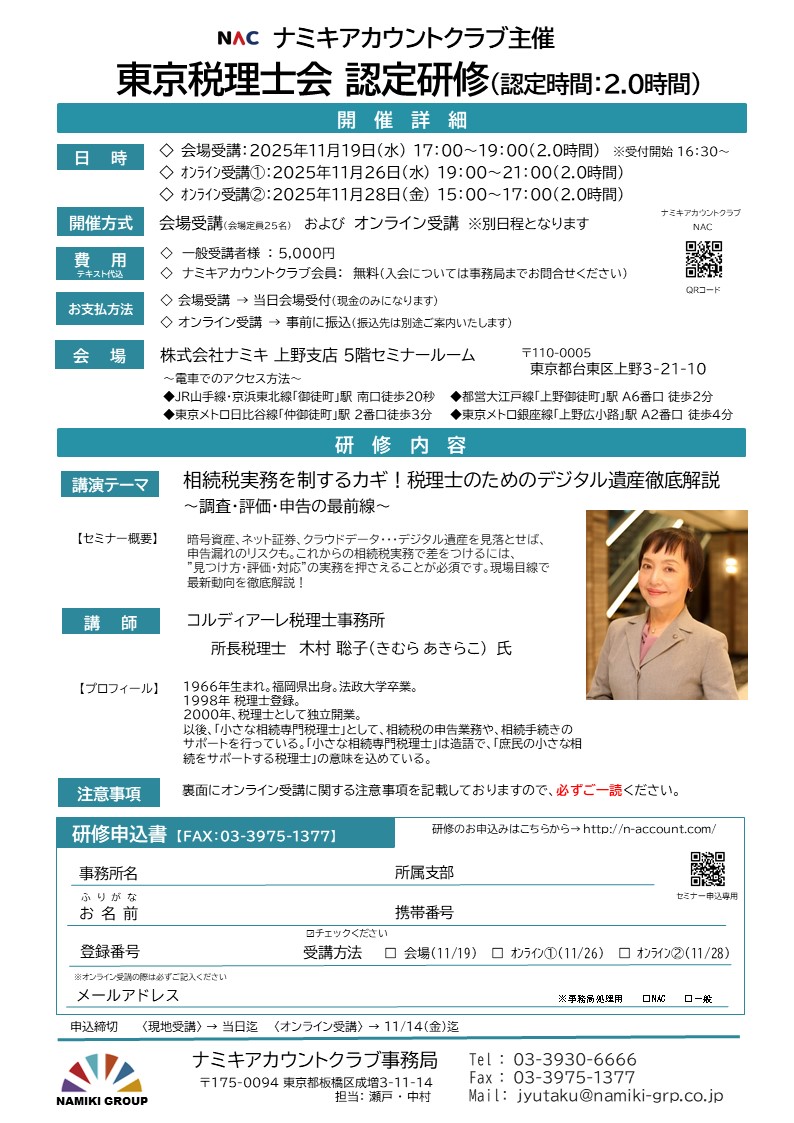 【ナミキアカウントクラブ主催 東京税理士会認定研修開催決定のご案内】