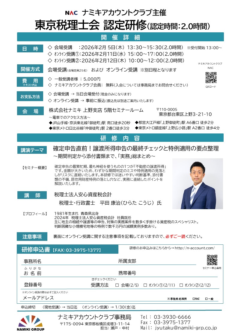 【ナミキアカウントクラブ主催 東京税理士会認定研修開催決定のご案内】